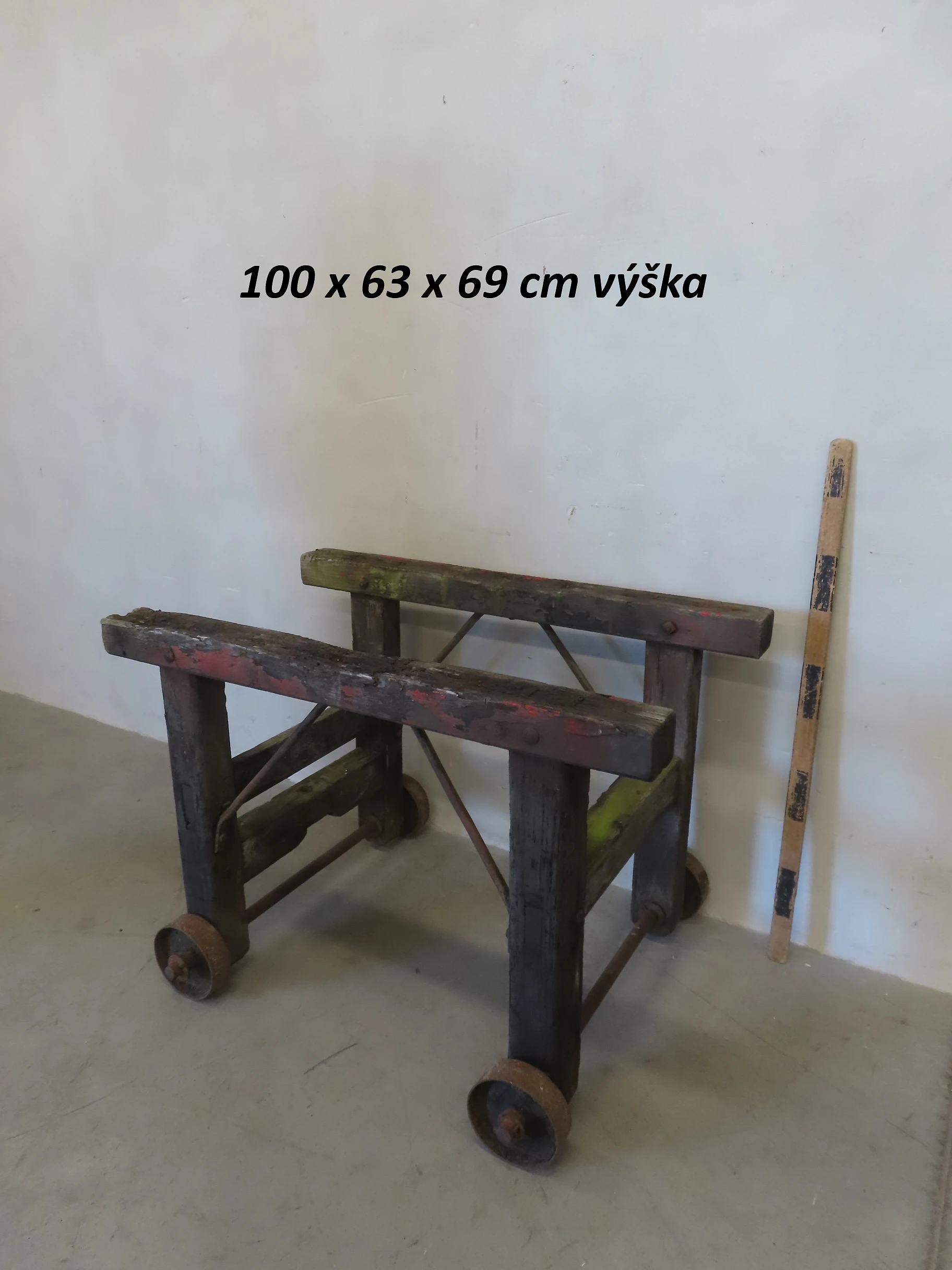 Massiver hölzerner Werkstattwagen aus der ersten Hälfte des 20. Jahrhunderts, mit ausgeprägter industrieller Patina, Spuren der Originallackierung und einem verrosteten Stahlrad unter jedem Bein. Die robuste Konstruktion mit schrägen Verstrebungen und breiten Balken wirkt authentisch und erinnert an die Umgebung von Fabriken, Lagerhäusern oder Eisenbahnwerkstätten. Ein Bodenstück, das sich für den Innenbereich eignet, ideal als Filmrequisite, Dekoration für eine Industrieszene oder als Grundelement einer Arbeit.