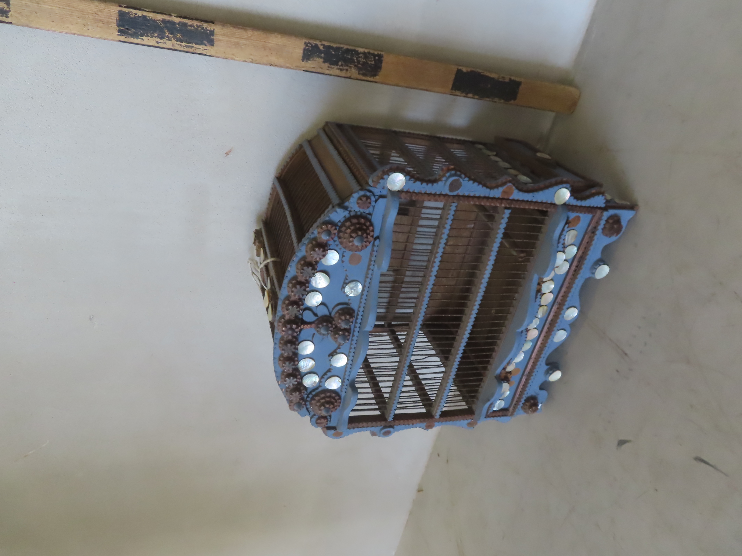 Dekorativní ptačí klec, 1. pol. 20. století (lidová/ateliérová práce); dřevěný rám s drátěnými pruty, modře lakované lišty zdobené výseky a sklíčky/zrcátky, patina. Využití: měšťanský či venkovský interiér, salon/šantán, tržnice nebo cirkusová scéna, obchod se zvířaty, exotizující či boho dekor. Doporučení: rekvizita spíše dekorativní, ne pro živé ptáky.